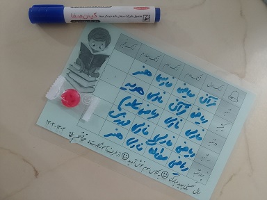سفارش با نام آموزگار دلخواه و کلاس دلخواه به صورت لمینت شده . قابل استفاده با ماژیک وایت برد برای نوشتن برنامه کلاسی و پاک کردن دوباره آن
